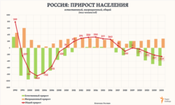 Общий прирост населения страны формируется двумя составляющими: естественным приростом и миграционным приростом (когда приехавших мигрантов оказывается больше, чем тех, кто уезжает из страны). И если с начала 2010-ых миграционный прирост еще перекрывал естественную убыль населения, обеспечивая общий прирост населения, то в последние годы он сокращается – при нарастающей естественной убыли. В 2018 году – впервые за последние 10 лет – в России было зафиксировано сокращение общей численности населения: