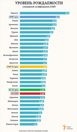 Четыре года назад суммарный коэффициент рождаемости в России существенно превышал средний уровень и для стран Европы, и для стран Организации экономического сотрудничества и развития (ОЭСР) - теперь же он оказывается ниже обоих. А в большинстве стран Западной Европы этот показатель заметно выше, чем текущий в России: