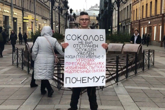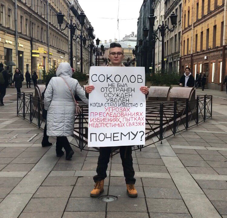 В центре Петербурга проходит пикет с критикой руководства СПбГУ и властей из-за того, что доцента Соколова не отстранили и не судили после жалоб студентов