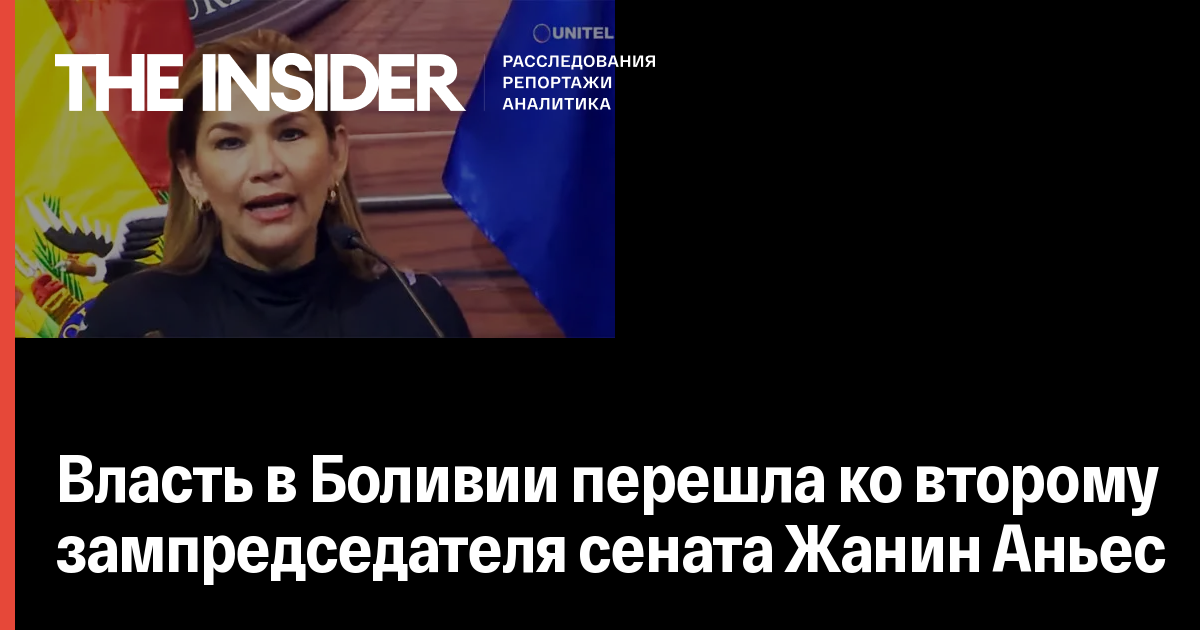 После отставки всего высшего руководства Боливии власть перешла ко второму заместителю председателя сената Боливии Жанин Аньес. Она проведет чрезвычайную сессию парламента Боливии, на которой будут официально приняты отставки президента Эво Моралеса и вице-президента Альваро Гарсии-Линеры.