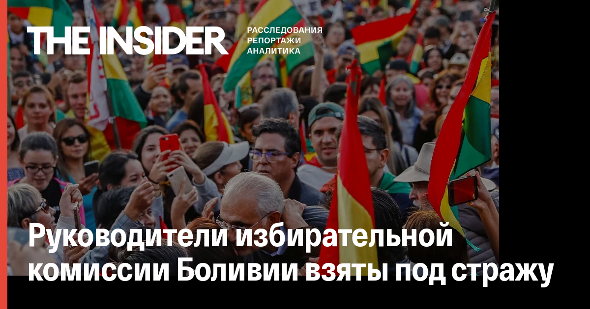 Полиция арестовала председателя Высшего избирательного суда (избирательной комиссии) Боливии Марию Эухению Чоке и ее заместителя Антонио Костаса. Об этом сообщает телеканал Unitel. Решение об аресте членов избиркома было принято министерством внутренних дел в связи с их причастностью к выявленным нарушениям, совершенным в ходе президентских выборов 20 октября.