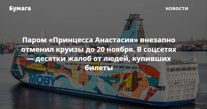 Паромный оператор Moby SPL отменил круизы на пароме «Принцесса Анастасия» до 20 ноября из-за внеплановых технических работ. Об этом в день первого отмененного круиза, 14 ноября, компания сообщила на официальном сайте. В соцсетях пользователи, представляющиеся покупателями билетов, жалуются на сервис из-за внезапных изменений.