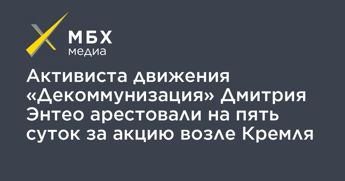 Замоскворецкий суд Москвы арестовал активиста движения «Декоммунизация» Дмитрия Энтео (Цорионова) на пять суток за акцию возле Кремля с баннером «Стоп Гулаг». Об этом «МБХ медиа» сообщил его адвокат Леонид Соловьев.