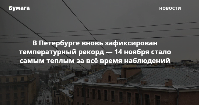 Прошедшее 14 ноября в Петербурге стало самым теплым за всю историю наблюдений. Об этом сообщил синоптик центра «Фобос» Михаил Леус на своей странице в фейсбуке.