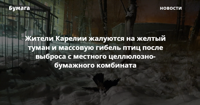 В карельской Сегеже местные жители жалуются на желтый туман и массовую гибель птиц и связывают это с выбросом с местного целлюлозно-бумажного комбината. Информация об этом появилась в социальных сетях.