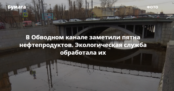 Петербуржцы заметили в Обводном канале пятна нефтепродуктов, которые тянутся от Ново-Калинкина моста до Лиговского проспекта. Информацию о загрязнении подтвердили в комитете по природопользованию.