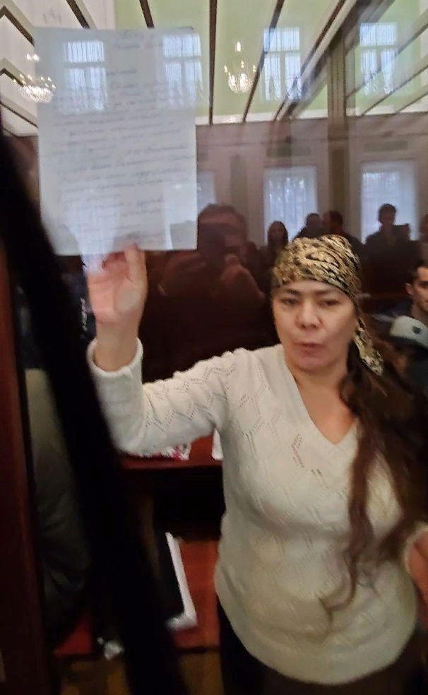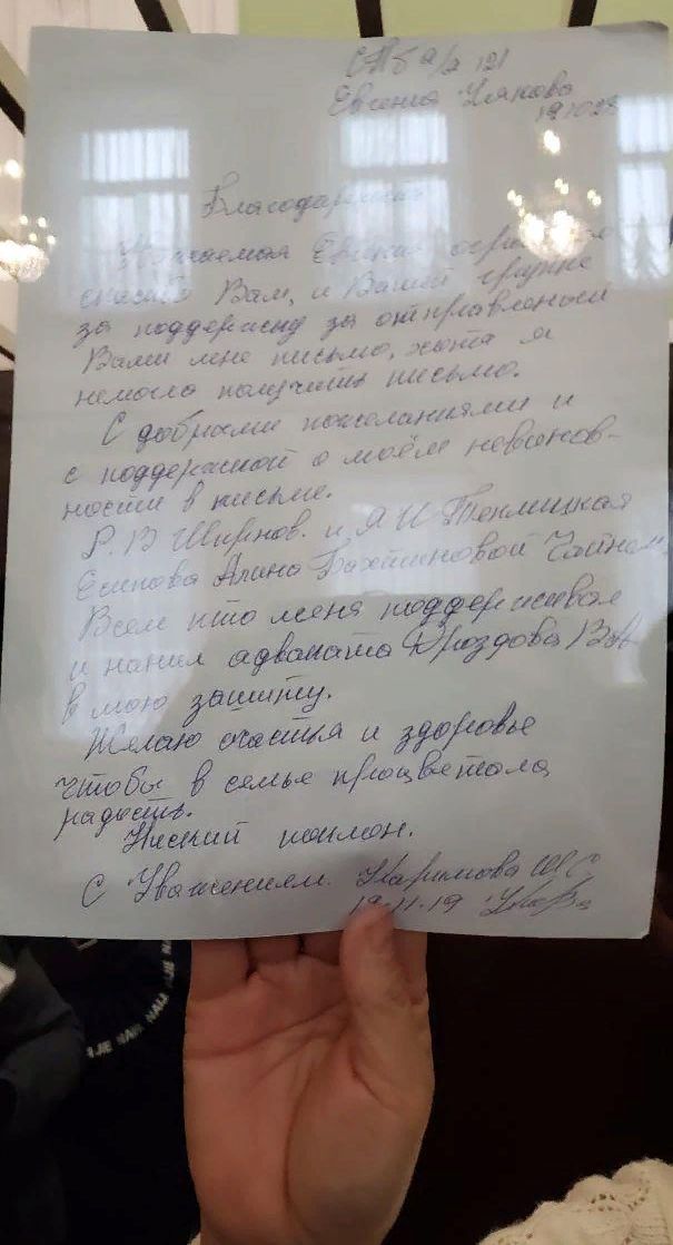 В начале заседания Каримова продемонстрировала листок с рукописным текстом, в котором выразила благодарность правозащитникам за письма и поддержку во время следствия и судов, а своего адвоката — за защиту.
