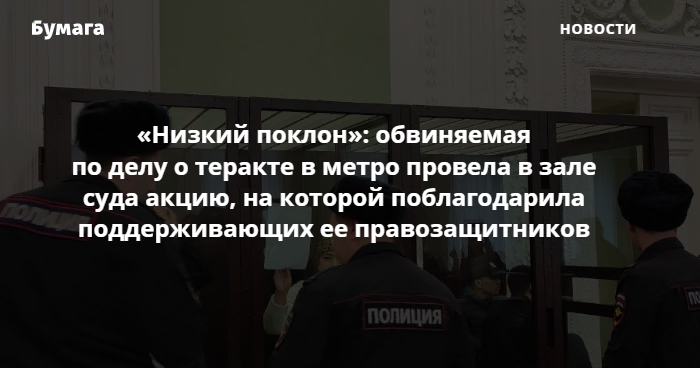 На суде по делу о теракте в петербургском метро одна из подсудимых, Шохиста Каримова, 18 ноября провела акцию, на которой поблагодарила поддерживающих ее правозащитников. Об этом сообщает корреспондентка «Бумаги» из зала суда.