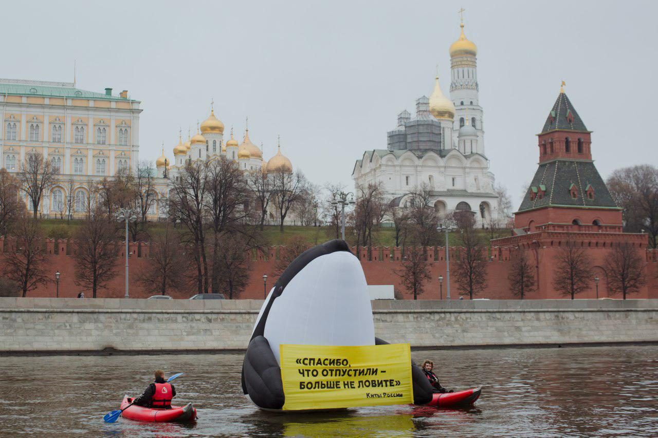 Фото: Денис Синяков / «Гринпис» 18 ноября рядом с Кремлевской набережной спустили на воду надувную косатку с плакатом «Спасибо, что отпустили — больше не ловите!» Таким образом активисты хотели привлечь внимание к необходимости запретить вылов китообразных в учебных и культурно-просветительских целях.