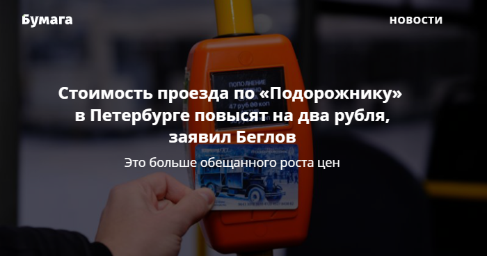 Губернатор Петербурга Александр Беглов заявил, что в 2020 году стоимость проезда в общественном транспорте для пользователей «Подорожника» и «Единой карты петербуржца» увеличится на два рубля. Исходя из озвученных губернатором цифр, цены вырастут примерно на 5–6 %, хотя Смольный официально обещал рост лишь на 4 %.