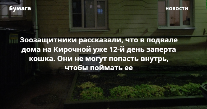 По словам зоозащитников, 8 ноября во дворе дома № 23 заколотили окно в подвал, а внутри осталась бездомная кошка. Жительница дома Виктория, ранее подкармливавшая кошку, услышала мяуканье за закрытым окном и попыталась достать ее, но для этого нужно было попасть в подвал. Ключи от подвала оказались лишь у бывшей председательницы домового совета, которая отказалась давать ключи без объяснения причин, пишут в группе «Леоneed».