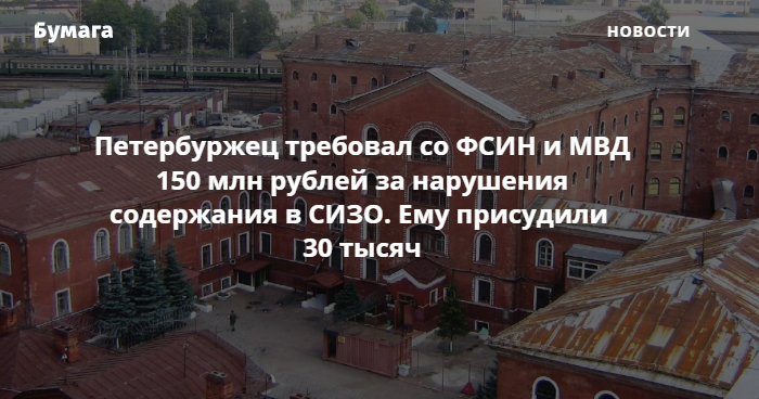 Колпинский районный суд Петербурга огласил решение по делу петербуржца Евгения Парамонова, который требовал с СИЗО-1, СИЗО-4, ФСИН, местного УМВД и министерства финансов более 150 миллионов рублей. Требования мужчины удовлетворили частично, присудив ему 30 тысяч рублей. Об этом сообщает пресс-служба городских судов.