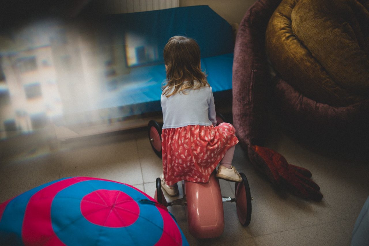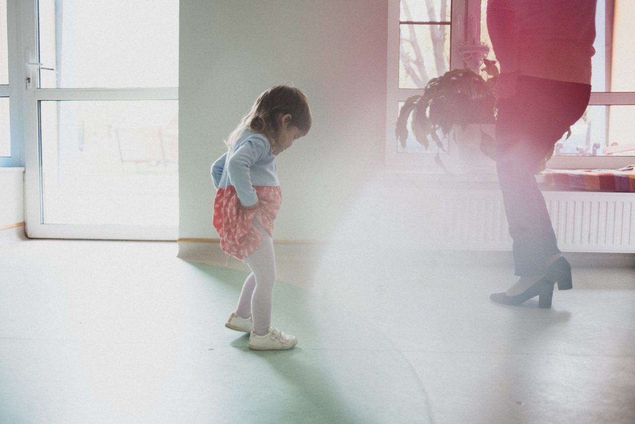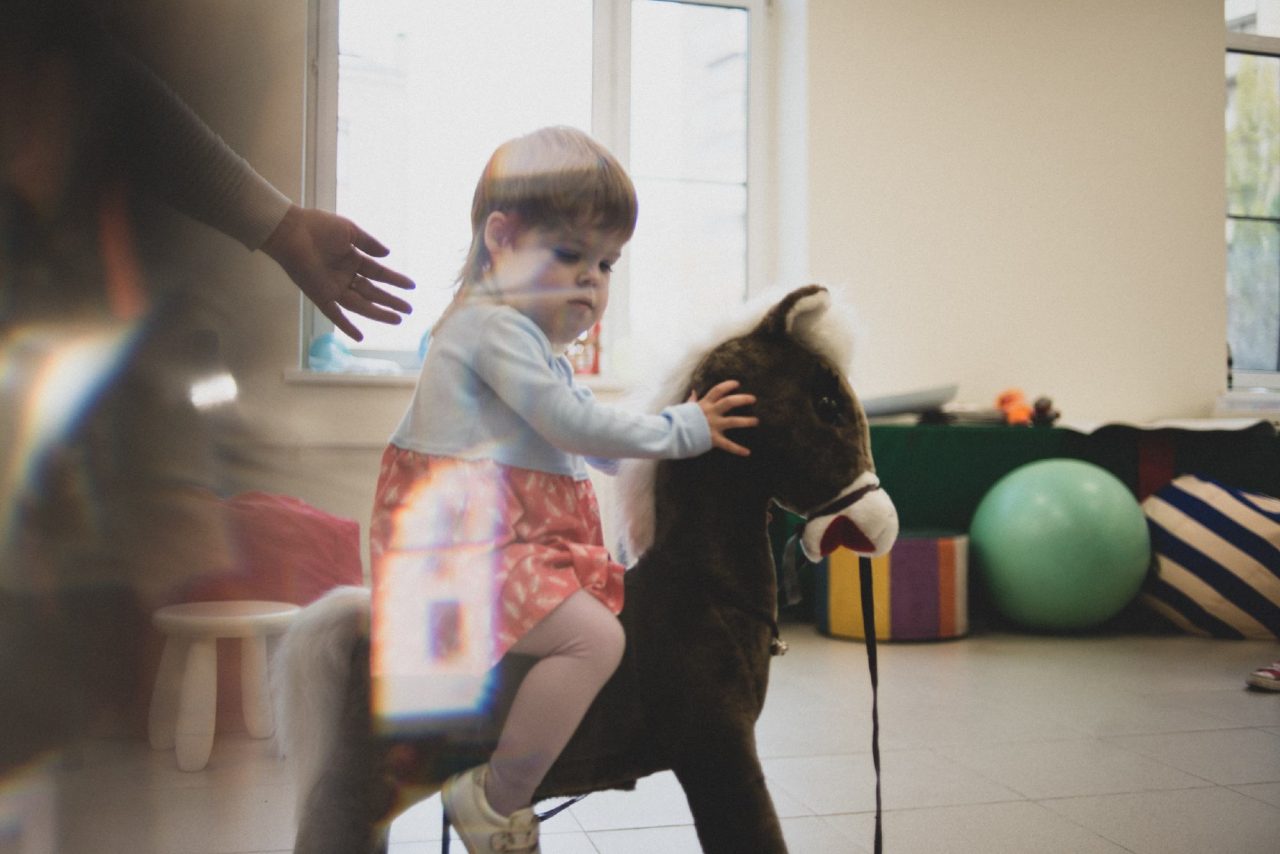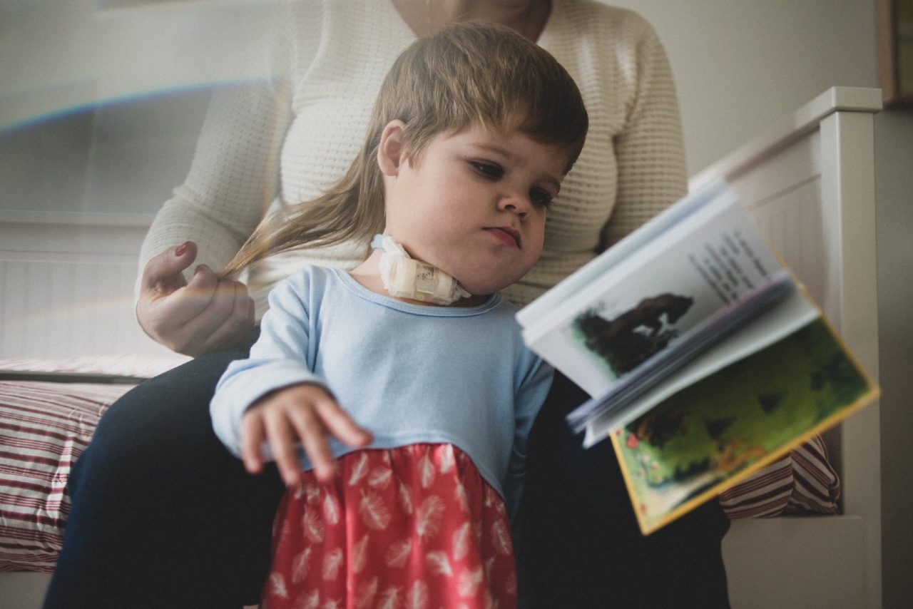 Ксюша бегает по кабинету хосписа, шумно дыша, из трахеостомы вырывается фырчание. Крутится на диване, пытается забраться на шкаф, хитрит и не хочет слезать с рук, вертит в руках игрушки — внешне ничем не отличается от любой другой двухлетней девочки, если не считать видимой припухлости щек.