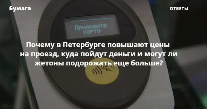 С 1 января 2020 года в Петербурге повысят цены на проезд в общественном транспорте: стоимость разового билета вырастет на 10 рублей. Коснутся ли нововведения льготников и пользователей «Единой карты петербуржца», чем власти объясняют необходимость роста цен и может ли проезд в метро и автобусе подорожать еще больше? «Бумага» отвечает на главные вопросы о повышении тарифов в общественном транспорте Петербурга.Цены на проезд повышают на 10 рублей. Подорожают и метро, и автобусы, и маршрутки?