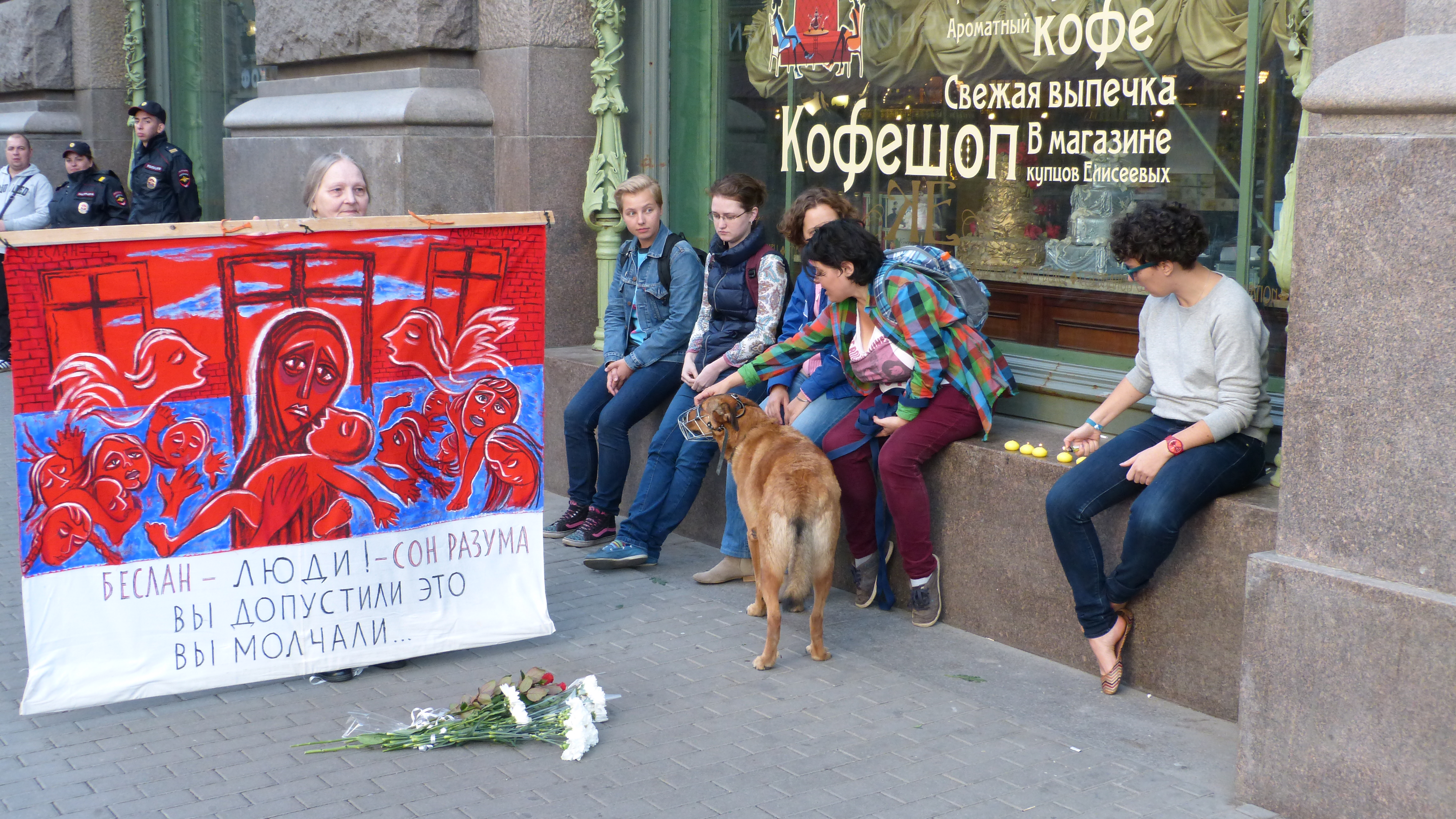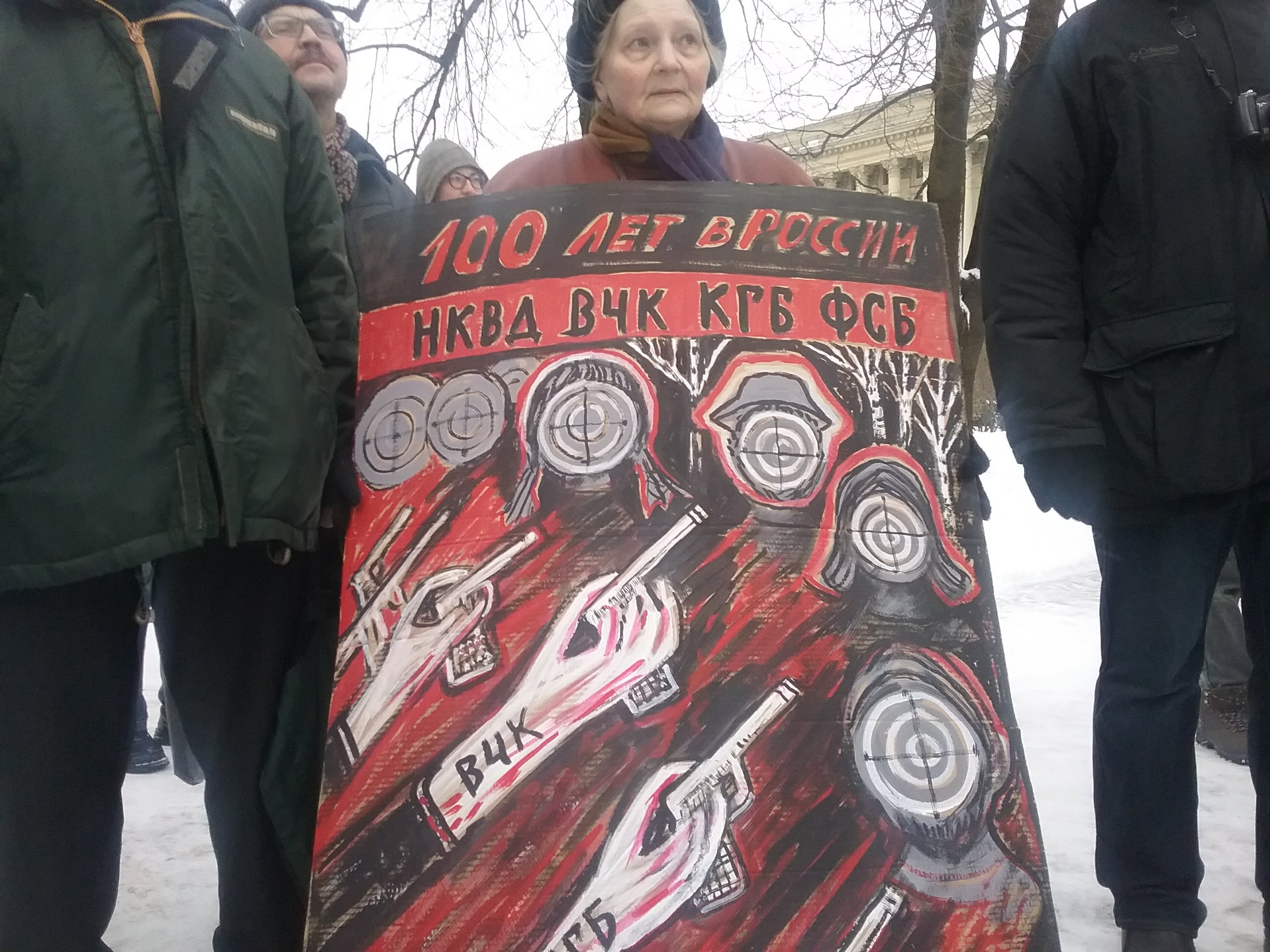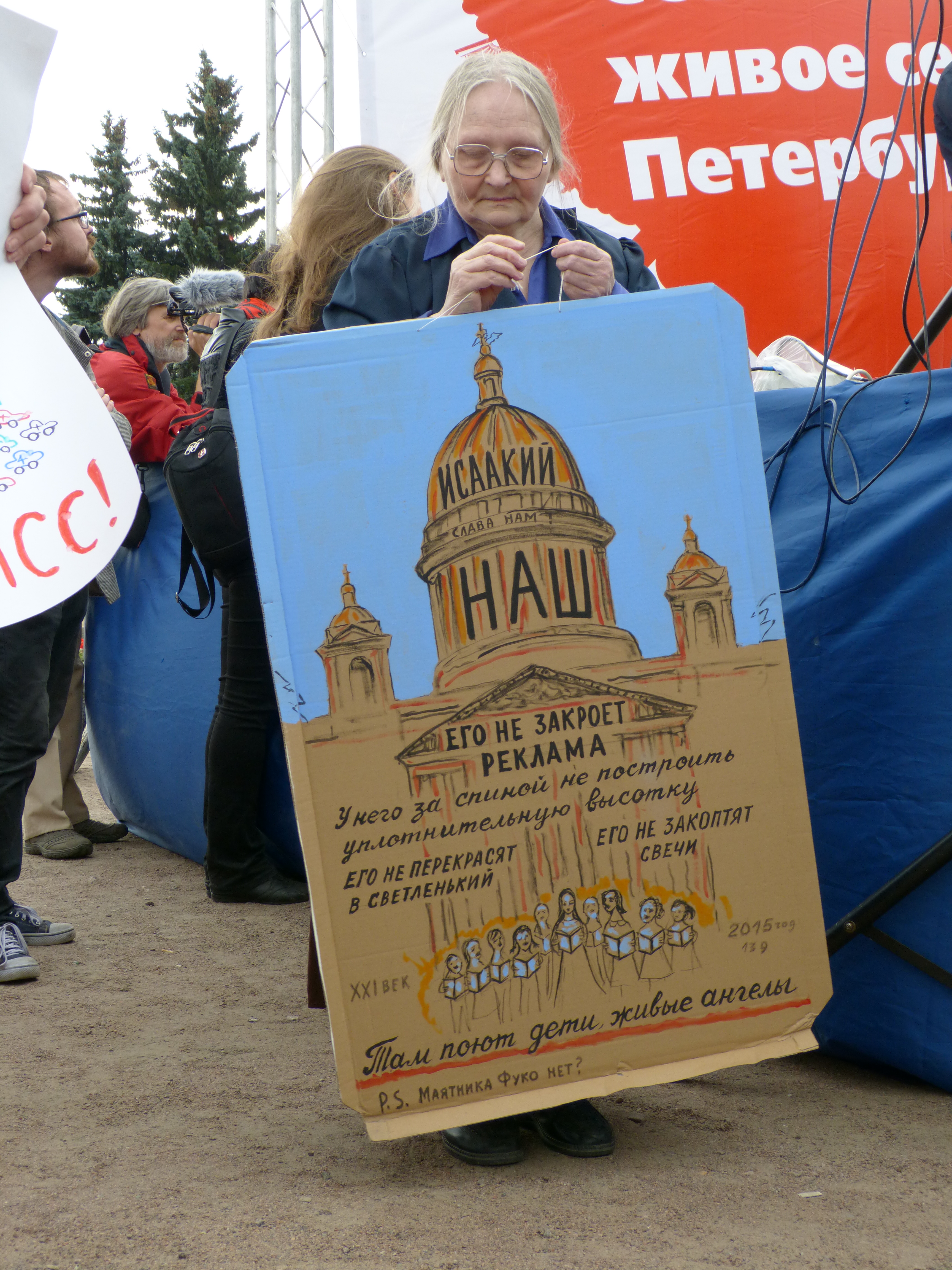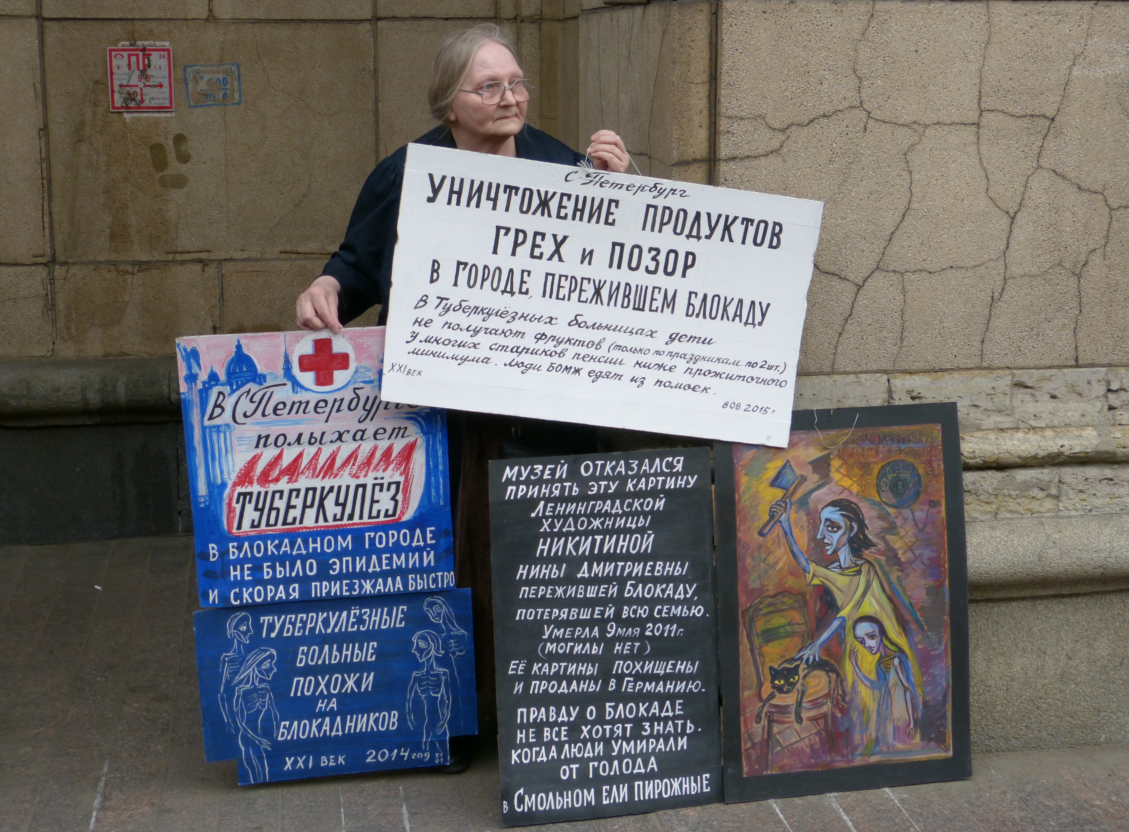 Так у нее повелось начиная с трагедии “Норд-Оста” – тогда она еще никого не знала, выходила одна, но год за годом обрастала соратниками и единомышленниками. Ее плакаты посвящены самым разным темам – поддержке политзаключенных, войнам в Сирии и Украине; уничтожению санкционных продуктов, оскорбительному для города, пережившего блокаду; защите Pussy Riot, Сенцова, “болотников”; защите Исаакиевского собора, памяти жертв коммунистического террора, – всего не перечислишь.
