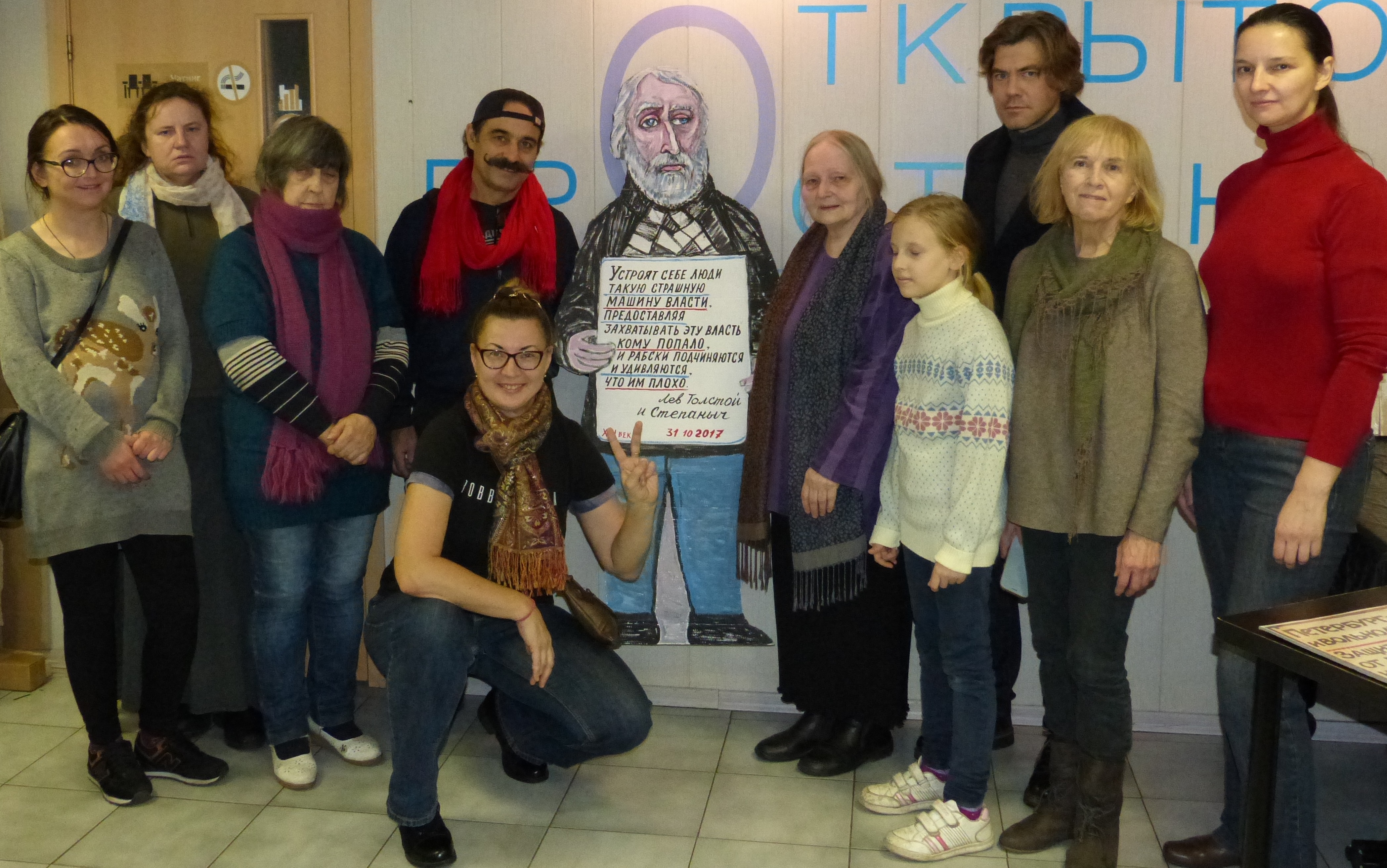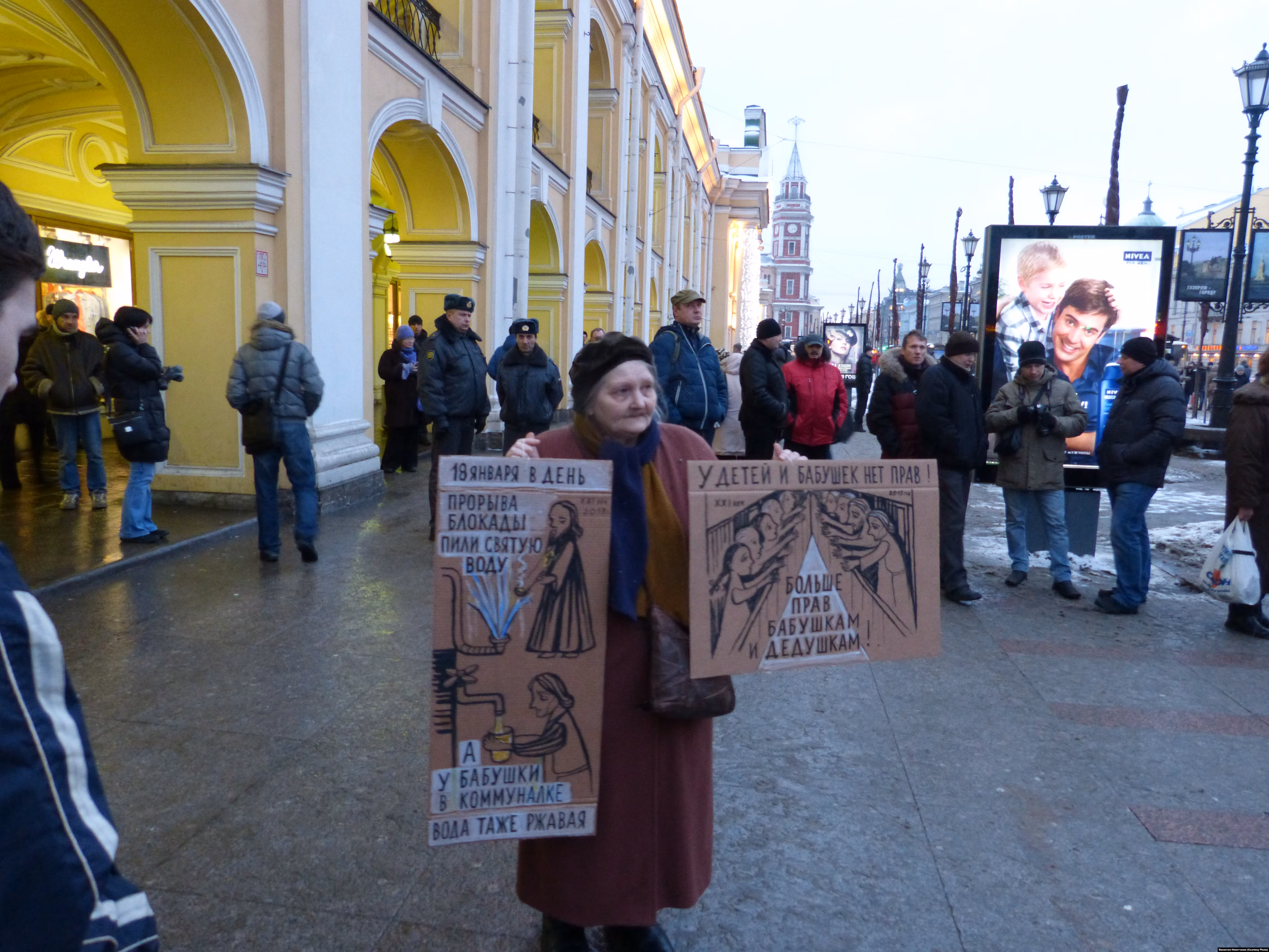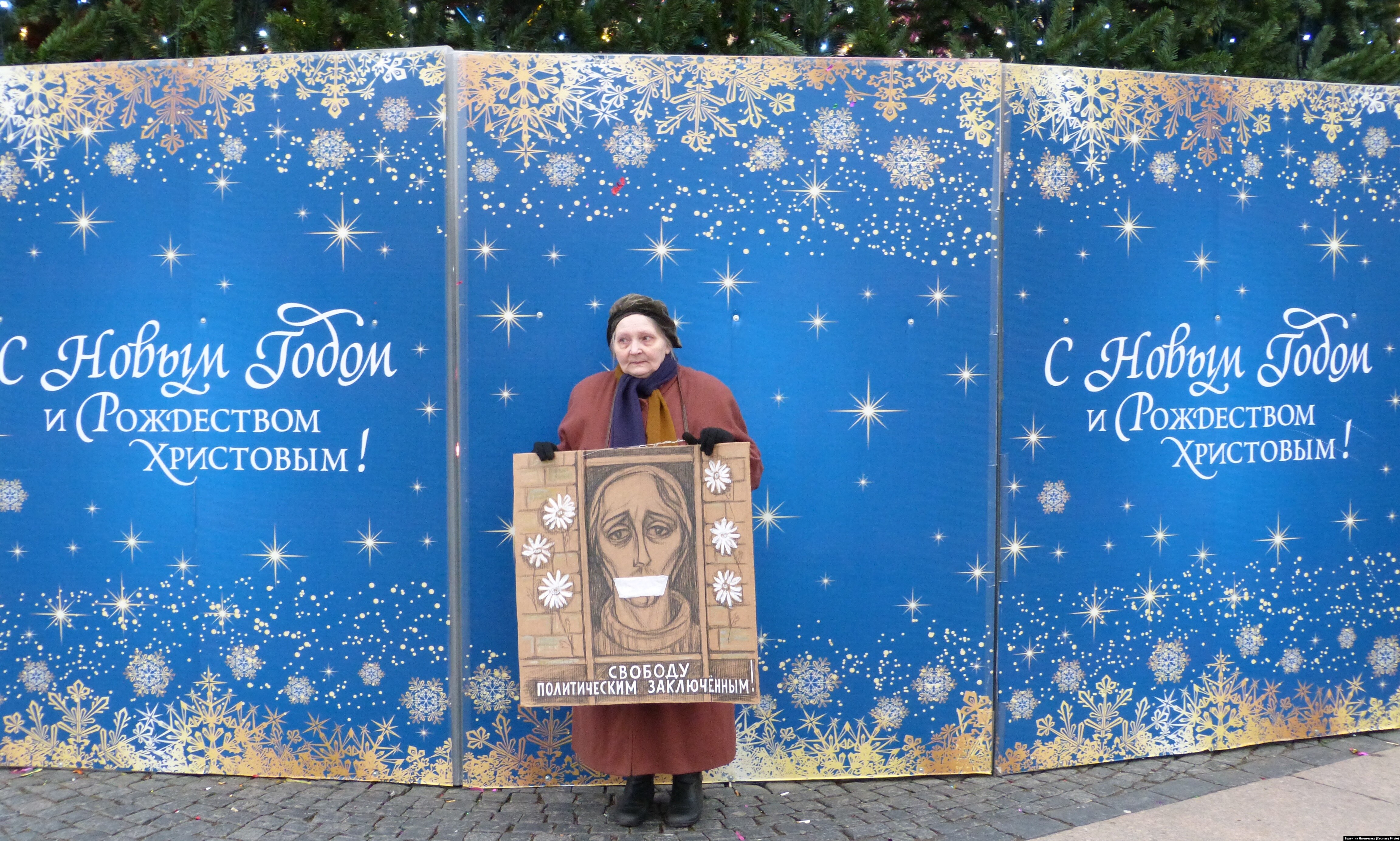 Май 2012 года: пожилая женщина, скромно одетая, стоит в одиночном пикете с плакатом “Мамы мира против атомной энергии”, в декабре – поздравляет сограждан с Новым годом: наверху плаката поют ангелы, под ними – лица с заклеенными ртами: “Pussy Riot, Другая Россия и все Другие”. А вот и январь: у Гостиного Двора та же фигурка с плакатами, которые фотографирует прилежный полицейский. Какое бы событие ни взволновало, ни возмутило Елену Осипову, она рисует плакат в своем особом стиле и выходит на улицу – чаще всего с одиночным пикетом. Возраст и самочувствие, не всегда идеальные, никогда не являются для нее препятствием, чтобы "выйти на площадь".