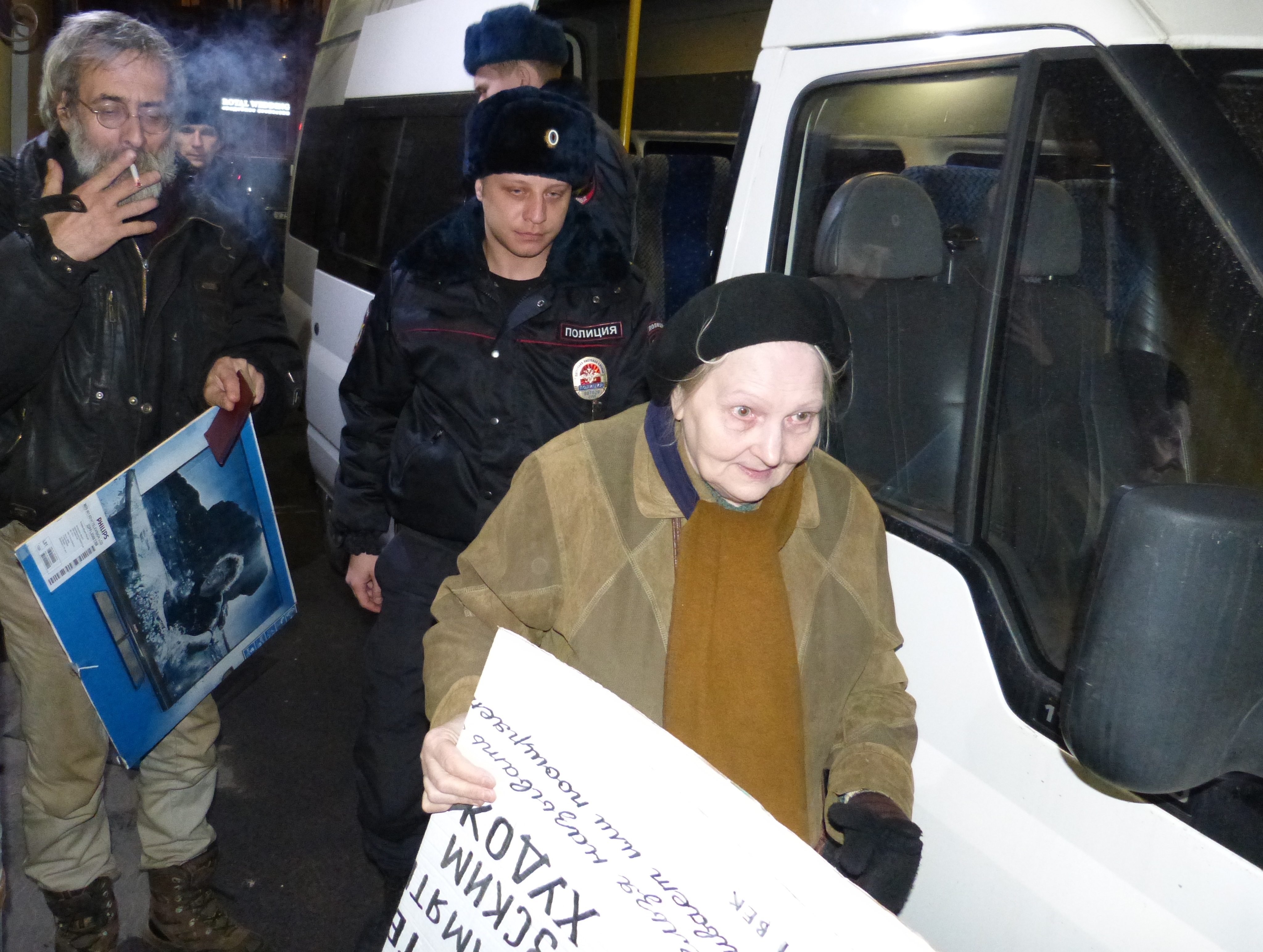 Вот еще фотография – двое полицейских ведут бабушку под руки к машине: задержали. Впрочем, на задержания Елена Андреевна особо не жалуется, хотя в “ментовку” попадала не однажды: больше всего ее огорчает потеря плакатов – как назло, всегда отбирают самые удачные. Один такой момент тоже попал в кадр – где ее с тремя большими плакатами заводят в полицейскую “Газель”.