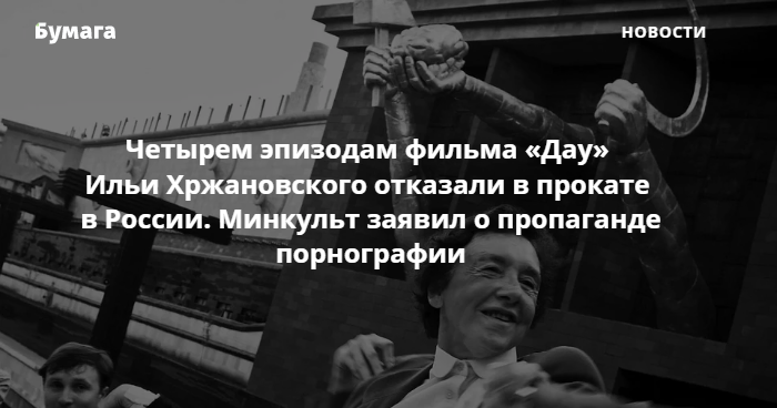 Министерство культуры России отказало в выдаче прокатного удостоверения четырем эпизодам многосерийного фильма «Дау» режиссера Ильи Хржановского, сообщили на сайте ведомства. Всего в министерство направили десять эпизодов, из которых шесть получили право проката.