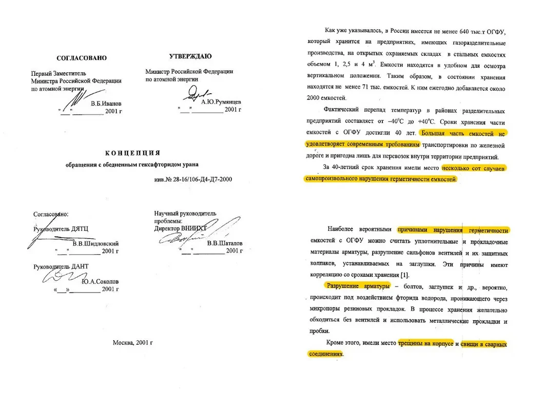 Проблемы могут возникнуть и в местах хранения урановых «хвостов». По общемировой практике, ОГФУ содержат в стальных цилиндрах на полигонах под открытым небом. При этом тару периодически надо менять и обновлять — и к этому в России тоже есть вопросы. Так, в документах Минатома за 2001 год (есть в распоряжении «Новой») говорится о сотнях случаев разгерметизации таких контейнеров.