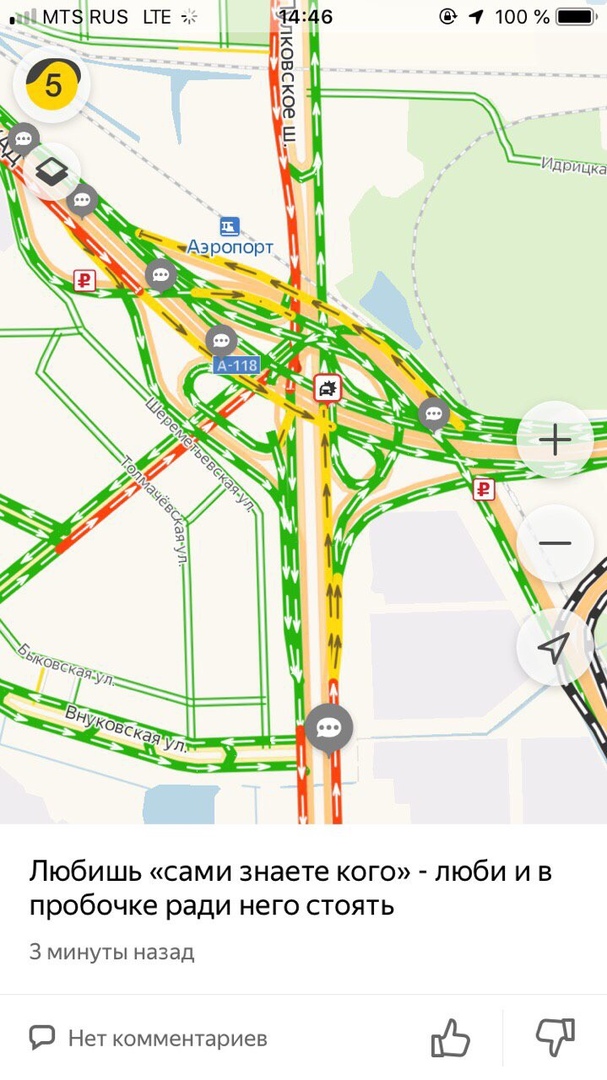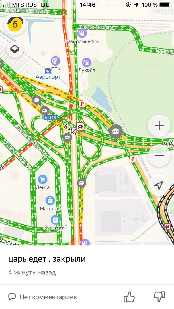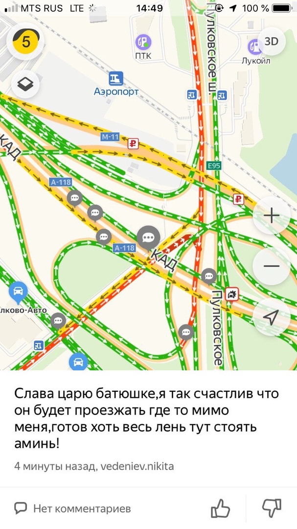 На внешнем кольце образовалась пробка длиной в 2,5 км перед развязкой КАД с Пулковским шоссе и М-11. Там же недавно находился президент РФ Владимир Путин, объявивший об открытии трассы из Петербурга в Москву. Именно Путина водители обвиняют в пробках.