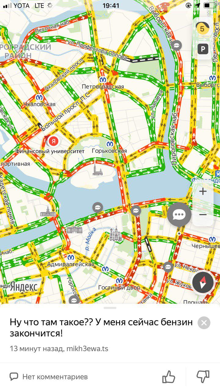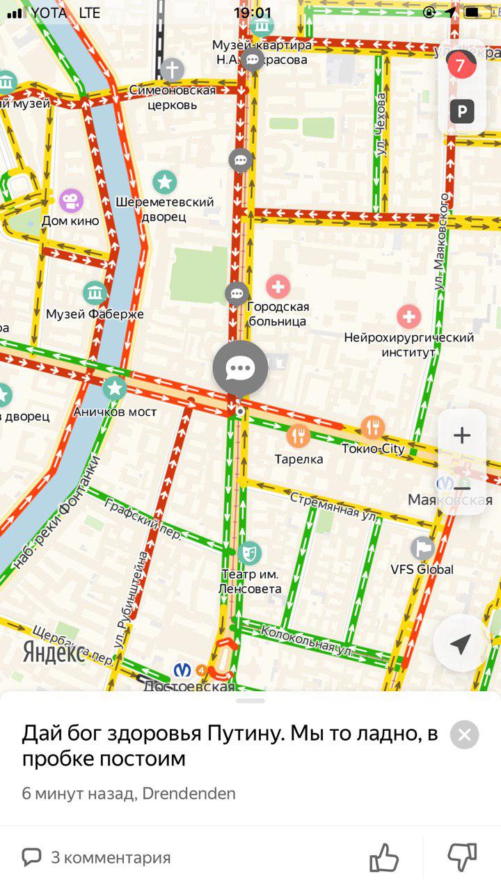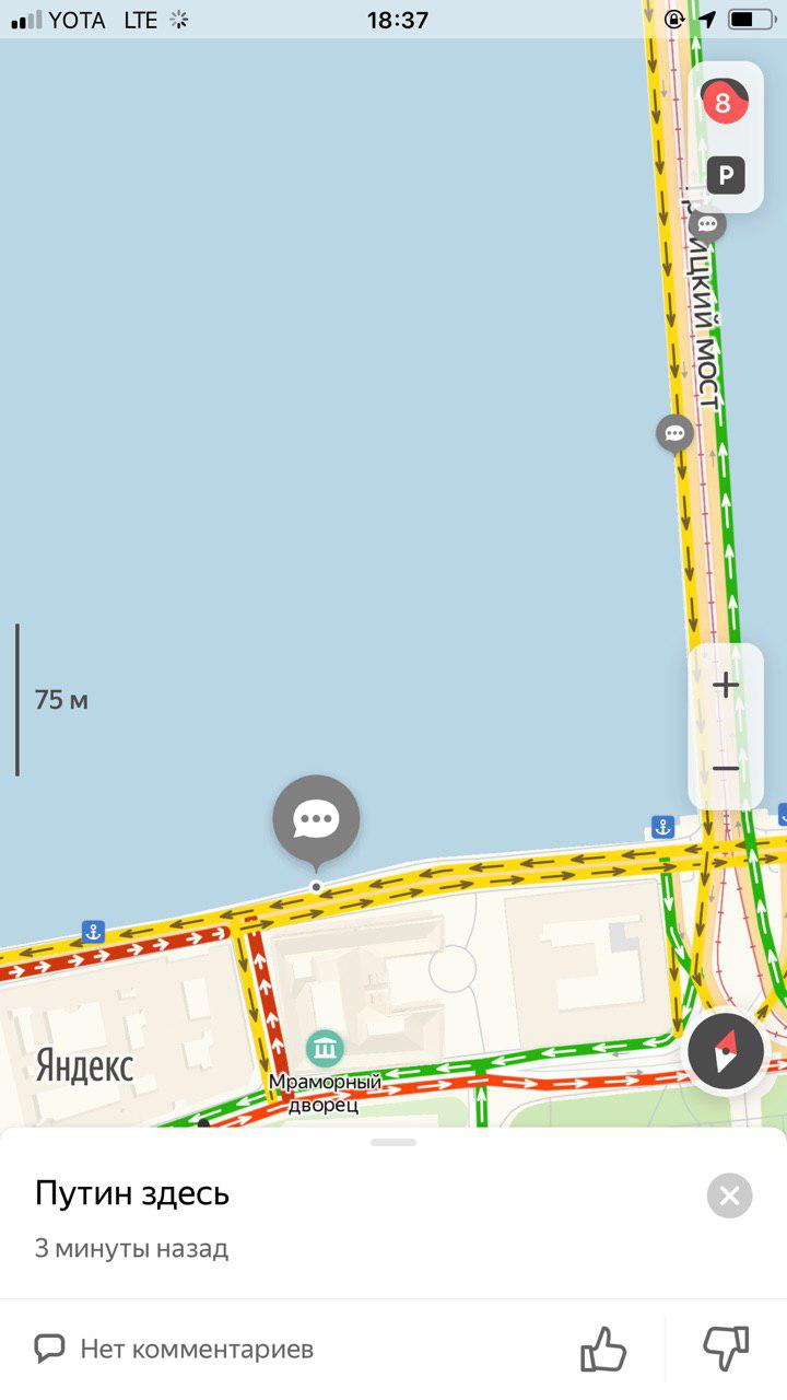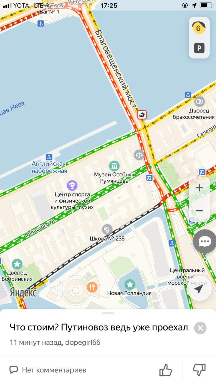 Из-за приезда Путина водители весь день стоят в пробках — днем перекрывали часть КАД и въезды со стороны Рыбацкого и Софийской улицы, Дворцовый и Троицкий мосты, а в 18:40 сервис «Яндекс.карты» оценивал пробки в городе в восемь баллов.