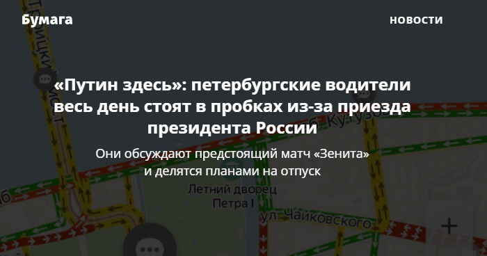«Путин здесь»: петербургские водители весь день стоят в пробках из-за приезда президента России. Они обсуждают предстоящий матч «Зенита» и делятся планами на отпуск