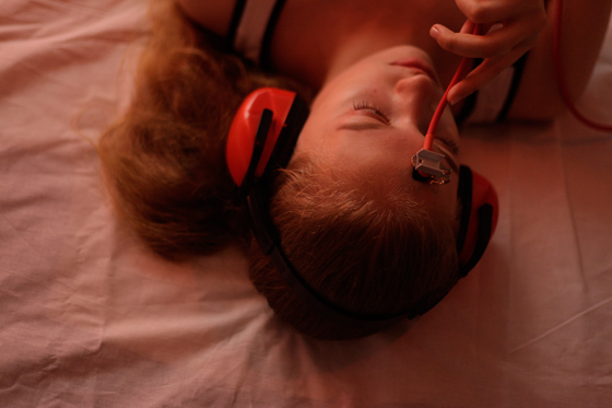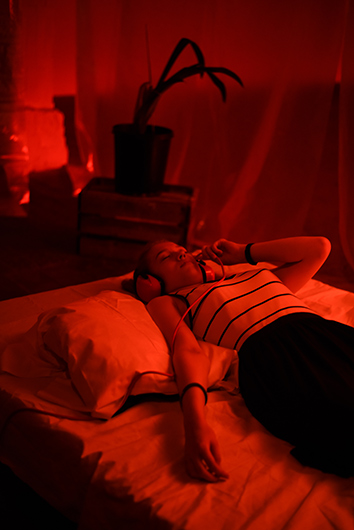 Молокова: Конечно, проектов, которые используют феномен костной проводимости, гораздо больше. Мне кажется, каждый второй или третий саунд-артист хоть когда-нибудь да обращался к такому типу взаимодействия со зрителем в своих работах. Но все эти проекты выглядят по-разному, и форма взаимодействия тоже меняется. Для меня интерес представляет, во-первых, то, как я выстраиваю коммуникацию со зрителем, а во-вторых, музыкальная часть, которая создавалась специально для этого устройства. Ее нельзя послушать на колонках. Это работа со спектром и частотой звука. Сначала были звуки, связанные с медицинской тематикой, потом я включила туда природные звуки. Например, там есть пение птиц, которое как будто звучит у тебя в голове. Получается интересный сдвиг пространства: птицы звучат очень натурально, будто они здесь — одновременно и снаружи, и внутри.