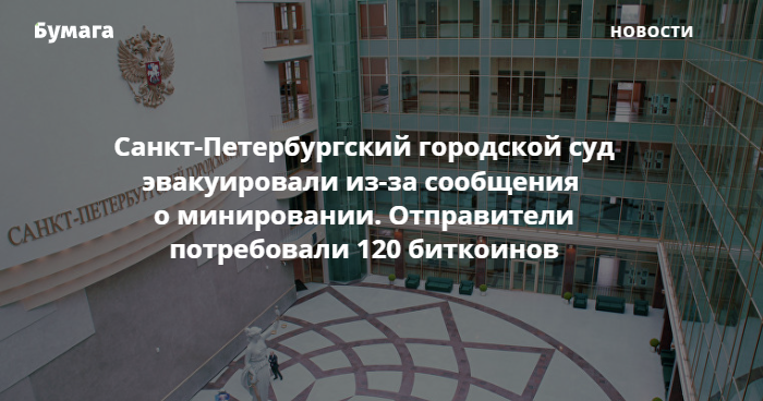 Сначала людей эвакуировали из Санкт-Петербургского городского суда на улице Бассейной, 6. До этого на электронную почту суда поступило сообщение о минировании здания. Согласно распечатке сообщения, отправители потребовали 120 биткоинов (примерно 57 миллионов рублей) под угрозой взрыва. В распечатке говорится, что эти деньги были якобы украдены с русскоязычной биржи WEX.