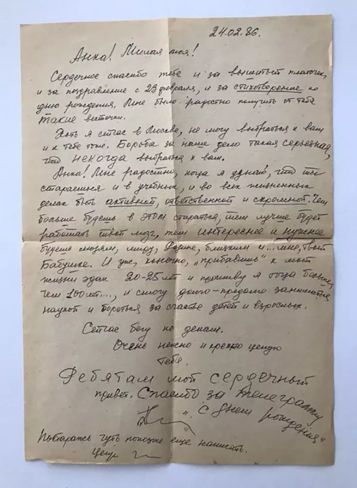 Бабушка писала Анне: «Борьба за наше дело такая серьезная, что некогда выбраться к вам. Анна! Мне радостно, когда я узнаю, что ты стараешься и в учебных, и во всех жизненных делах быть активной, ответственной и скромной. Чем больше будешь в этом стараться, тем лучше будет работать твой мозг, тем интереснее и нужнее будешь людям, миру, Родине, близким и мне… твоей бабушке».