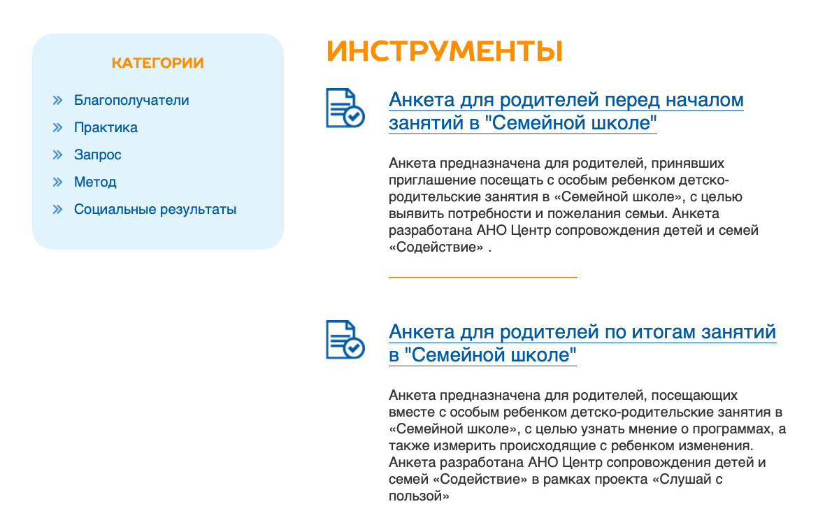 Опытные организации с собственным набором практик могут отправить команде «Слушай с пользой!» свои инструменты. После модерации их загрузят в базу. Инструменты будут размещены на портале с логотипом и названием фонда.