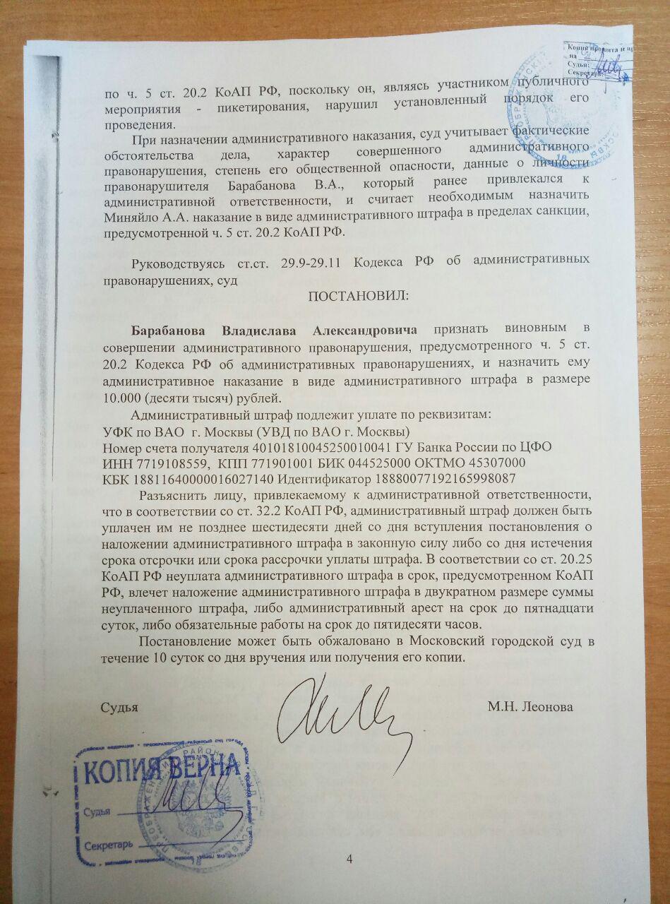 При этом в постановлении Преображенского суда по административному делу Барабанова вместо него упомянут Миняйло. «Суд учитывает (…) данные о личности правонарушителя Барабанова В.А, который ранее привлекался к административной ответственности, и считает необходимым назначить Миняйло А.А. наказание», — говорится в документе. Далее в постановлении ошибок нет: речь снова начинает идти о Барабанове.