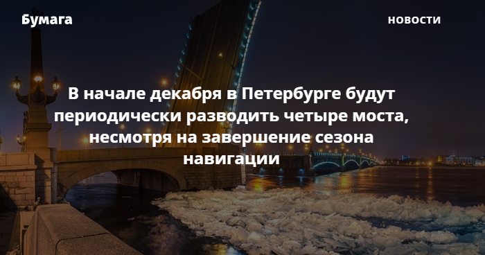 30 ноября в Петербурге завершился сезон навигации. Сообщалось, что за пределами навигационного периода разводка мостов возможна в редких случаях — например, для пропуска единичных судов, при технической необходимости или во время ликвидации чрезвычайных ситуаций.
