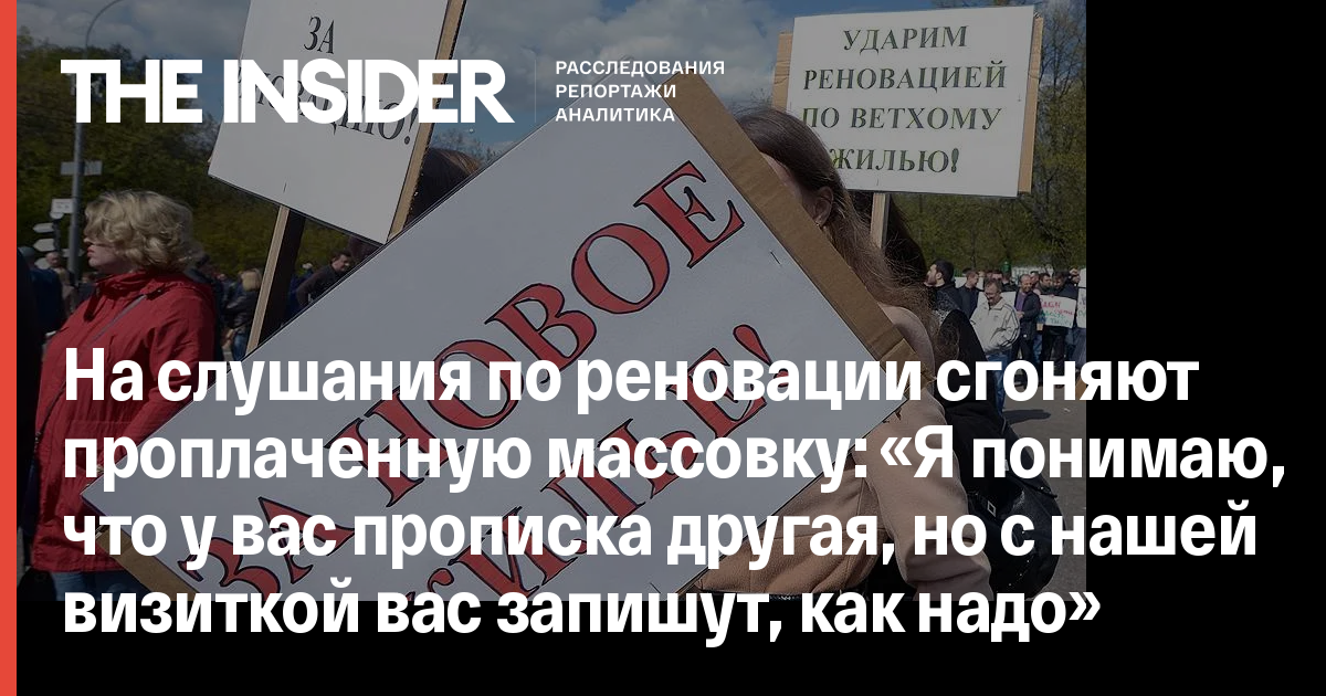 На слушания по реновации сгоняют проплаченную массовку: «Я понимаю, что у вас прописка другая, но с нашей визиткой вас запишут, как надо»