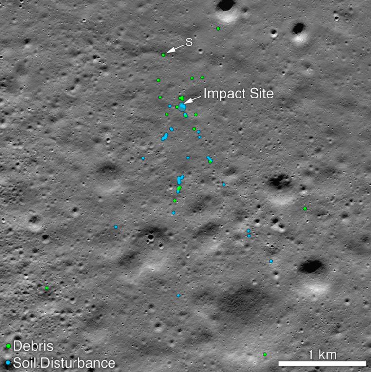 Обломки обнаружила станция Lunar Reconnaissance Orbiter. На опубликованном снимке зелеными точками обозначены обломки аппарата, синими — зафиксированные разрушения грунта, которые, скорее всего, стали результатом падения «Викрама». Изображение было сделано специалистами NASA 11 ноября.