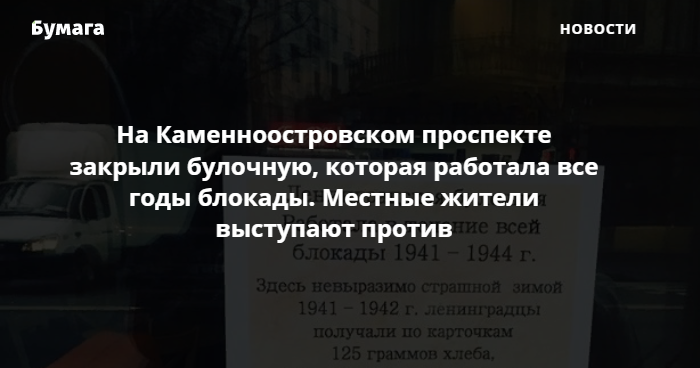 В Петроградском районе Петербурга закрылась булочная, которая проработала все годы блокады. Местные жители выступают против и создали на сайте Change.org петицию с требованием спасти историческое заведение.