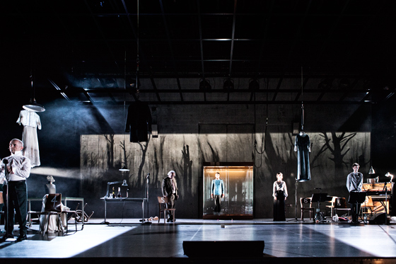 Режиссер, применяя всевозможные профессиональные техники — от актерского остранения до сценографического декупажа, ни на миг не прячет собственно механики происходящего: все по-честному, откровенно, даже не без эффектной обаятельной грубоватости, все винтики-колесики в механизме спектакля торчат наружу. «Пространство драмы» окружено рабочими столиками для актеров, значимые мизансцены выхвачены из темноты световыми лучами — но в полутьме продолжают действовать бесстрастные наблюдатели, комментируя происходящее, перемещаясь внутрь сюжета и покидая его легко и непринужденно. Гофмиллеров в спектакле двое (один из прошлого, другой из будущего, один действует, другому остается лишь хвататься за голову), пол и возраст — не помеха для актеров, которые играют в спектакле по несколько ролей. Голос главной героини время от времени не принадлежит актрисе, ее играющей, — откровенный «дубляж» разрушает романтическую иллюзию, если вдруг та начинает зарождаться. Доппельгангеры и говорящие куклы — Макберни, кажется, не забывает, что ставит историю, написанную о Первой мировой, именно в немецком театре.
