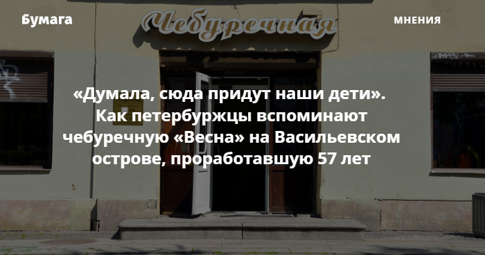 — Закрыли чебуречную «Весна» на 6 линии В. О., 19… Спустя 58 лет (на самом деле чуть больше 57 лет — прим. «Бумаги»)… Внезапно. Еще недельку назад там шныряли подвыпившие мужики в костюмчиках, тети-поварихи, обслуживающие за наличку… Последний оплот ленинградского духа ********** (сошел с ума — прим. «Бумаги»).