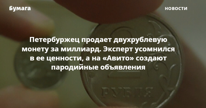 Петербуржец выставил на продажу на сервисе «Авито» двухрублевую монету с браком, указав цену на нее в 1 миллиард рублей. Объявление появилось еще 20 ноября, но недавно на него обратили внимание на сайте «Пикабу».