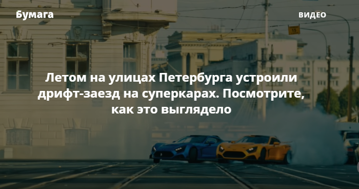 На ютьюб-канале профессионального гонщика из Петербурга Сергея Кабаргина появилось видео с парного дрифт-заезда по улицам города. В гонке на суперкарах Flanker F, которая проходила летом 2019 года, участвовал сам Кабаргин (ddKaba), а также гонщик Аркадий Цареградцев. Видео заезда опубликовано 9 декабря.