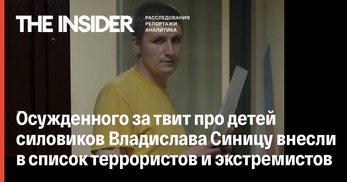 Владислава Синицу, приговоренного к пяти годам колонии за сообщение в Twitter про детей силовиков, внесли в список экстремистов и террористов. Об этом говорится в сообщении Росфинмониторинга, на которое обратило внимание «МБХ медиа».