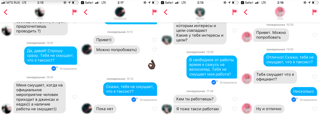 Паре девушек в Тиндере не нравится, что я таксист, но в основном всем плевать. Одна спросила, не смущает ли меня, что она официантка. Отказались встретиться только две девушки: «Мне важна образованность, целеустремлённость и умение/стремление работать мозгами». Остальные посмотрели профиль, сказали, что умеют читать и что главное — это какой я мудак и извращенец внутри, а твоя работа — ну, работа, в чём проблема.