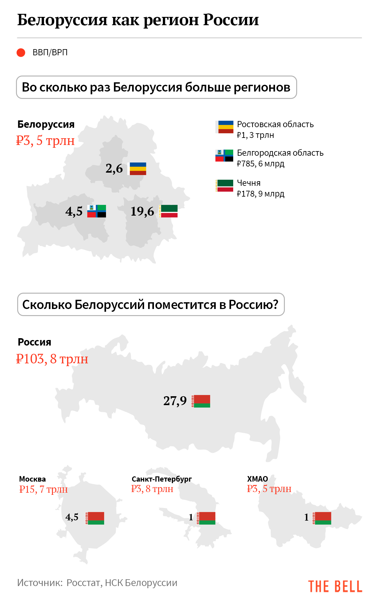 Пока разница только в том, что регионы не только получают всевозможные дотации и субсидии, но и приносят деньги в федеральный бюджет, а Белоруссия получает поддержку, не пополняя бюджет, заключает Салихов. Так что выгоды скорее политические. Почитать о них можно тут.