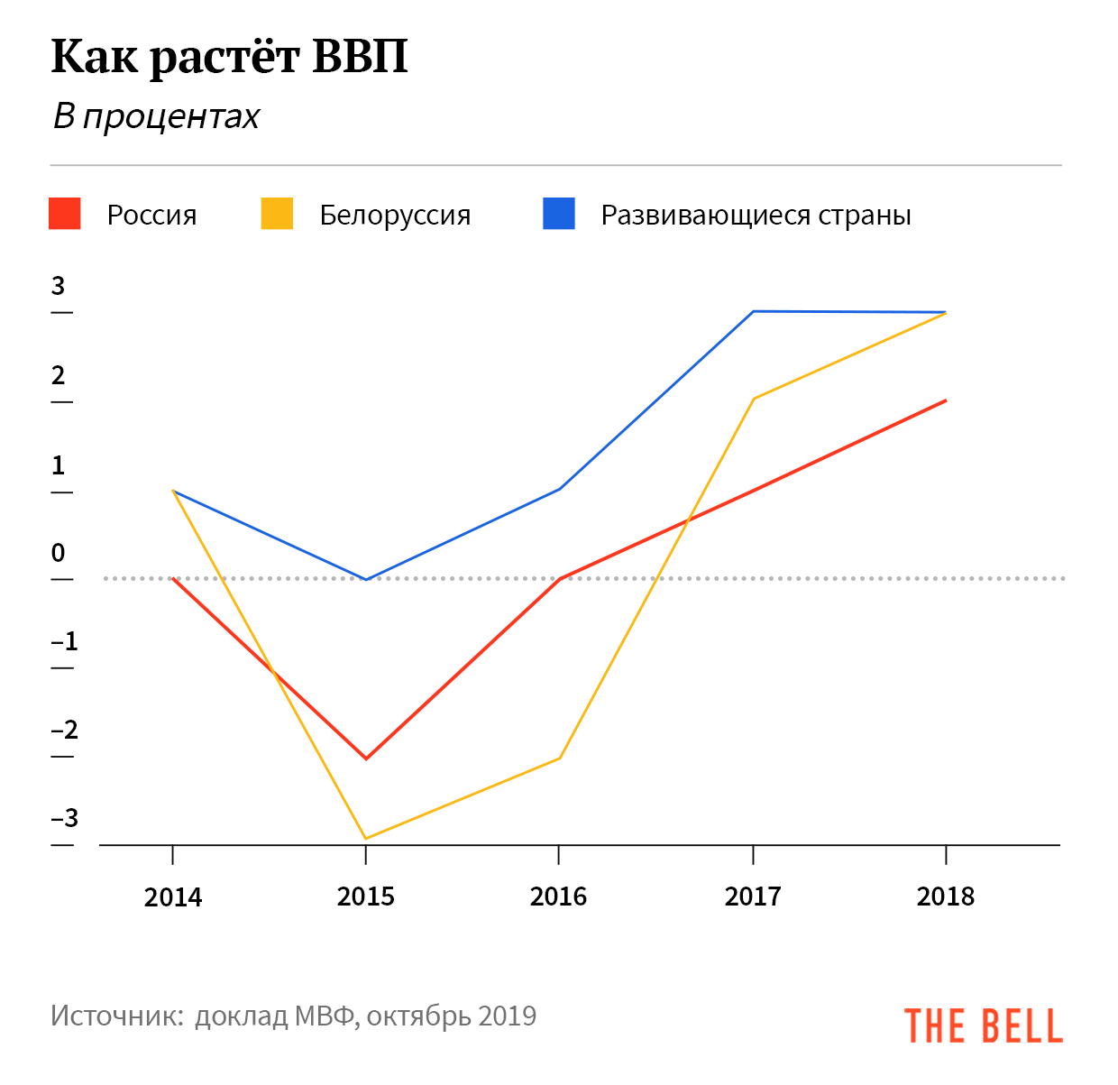 Начиная с 2011 года средние темпы роста ВВП в России составили 1,5%, в Белоруссии — 1,1%, следует из октябрьского доклада МВФ. Среднее значение для развивающихся экономик Европы — 2,8%. Правда, эксперты НИУ ВШЭ уверяют, что МВФ занижает прогнозы по Белоруссии.