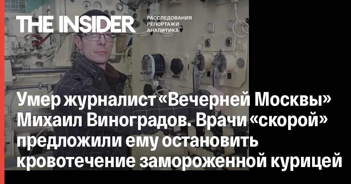 В Москве скончался журналист газеты «Вечерняя Москва» Михаил Виноградов, которому вовремя не оказали медицинскую помощь, передает «Интерфакс». О неоказании помощи Виноградов сообщил 10 декабря в Facebook. По его словам, врачи предложили ему приложить замороженную курицу к месту кровотечения.