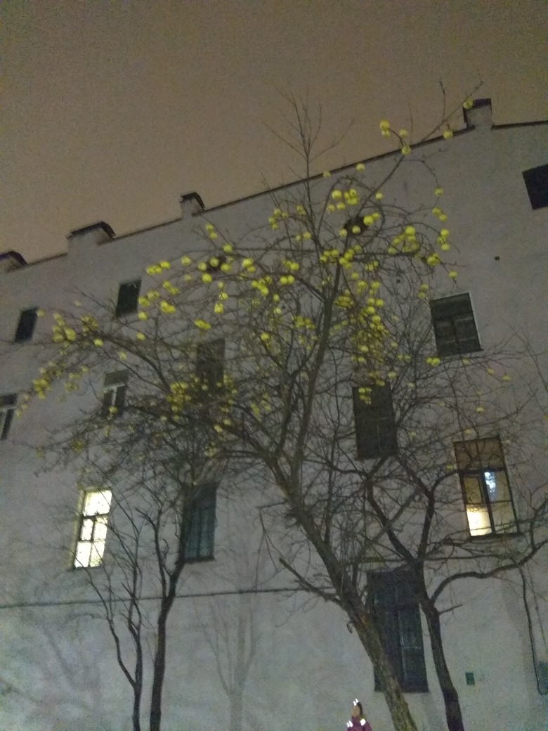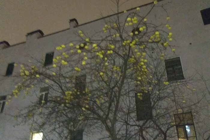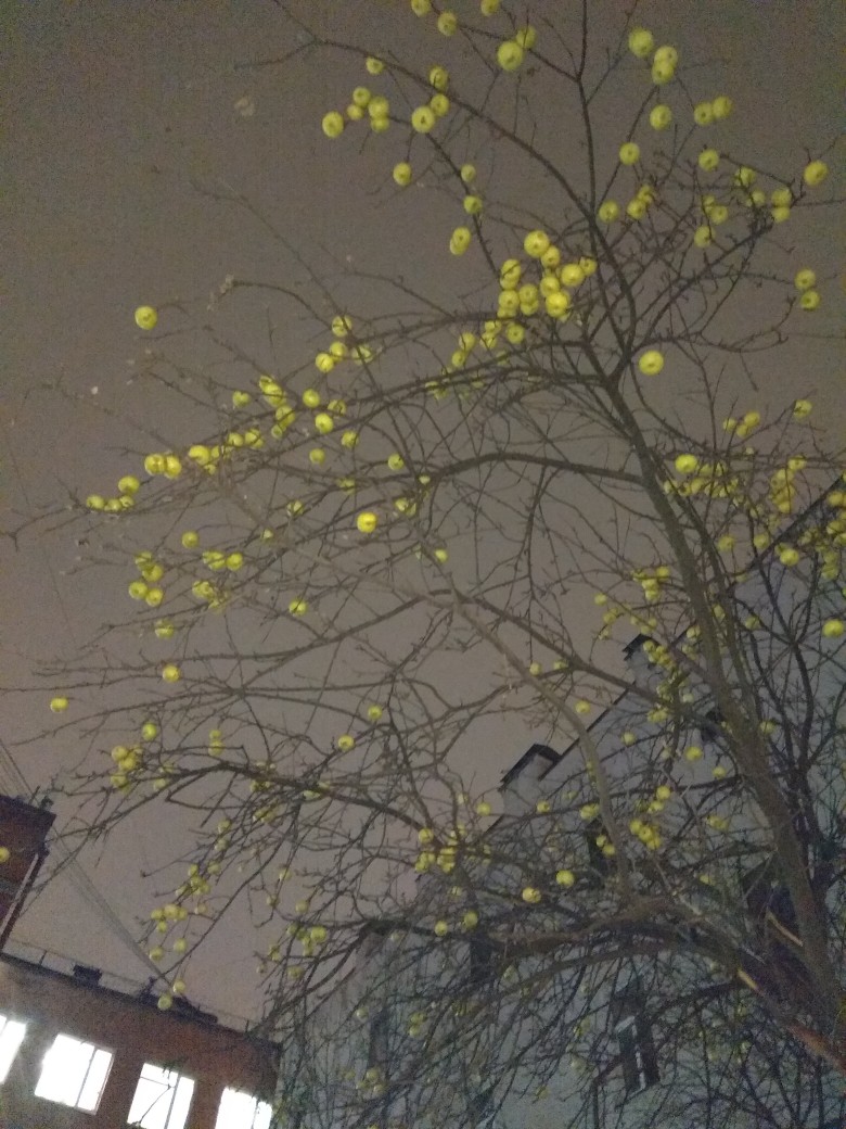 Дерево, усыпанное зелеными яблоками, растет во дворе Большого проспекта Петроградской стороны, 29/2. При этом на нем нет листьев, только плоды.