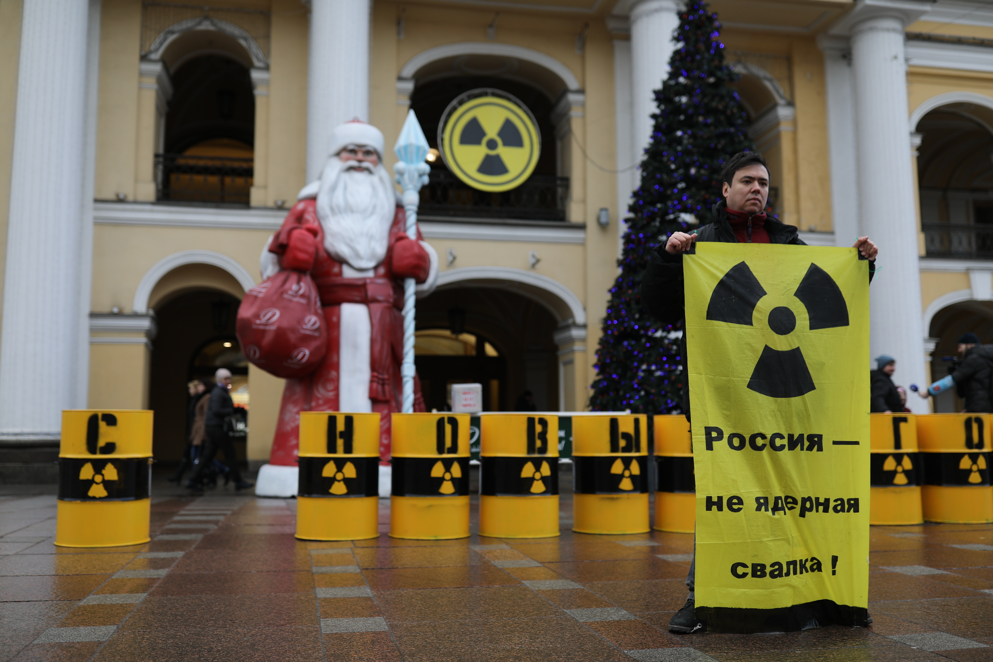 Сегодня эко-активисты провели в центре Петербурга акцию против ввоза урановых «хвостов» из Германии в Россию. Активисты сделали инсталляцию из бочек, имитирующих бочки с ядерными отходами, на которых было написано «С Новым годом!»