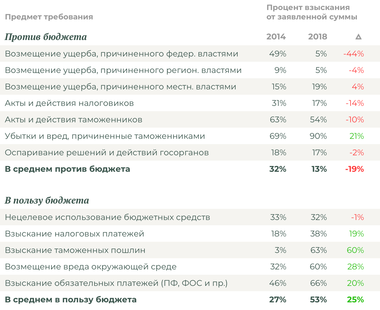 Слова собеседника подтверждаются статистикой. По сравнению с 2014 годом суды стали на 19% менее охотно взыскивать ущерб с госорганов и, наоборот, на четверть усерднее заботиться о пополнении казны решениями в пользу налоговой службы и других госорганов.