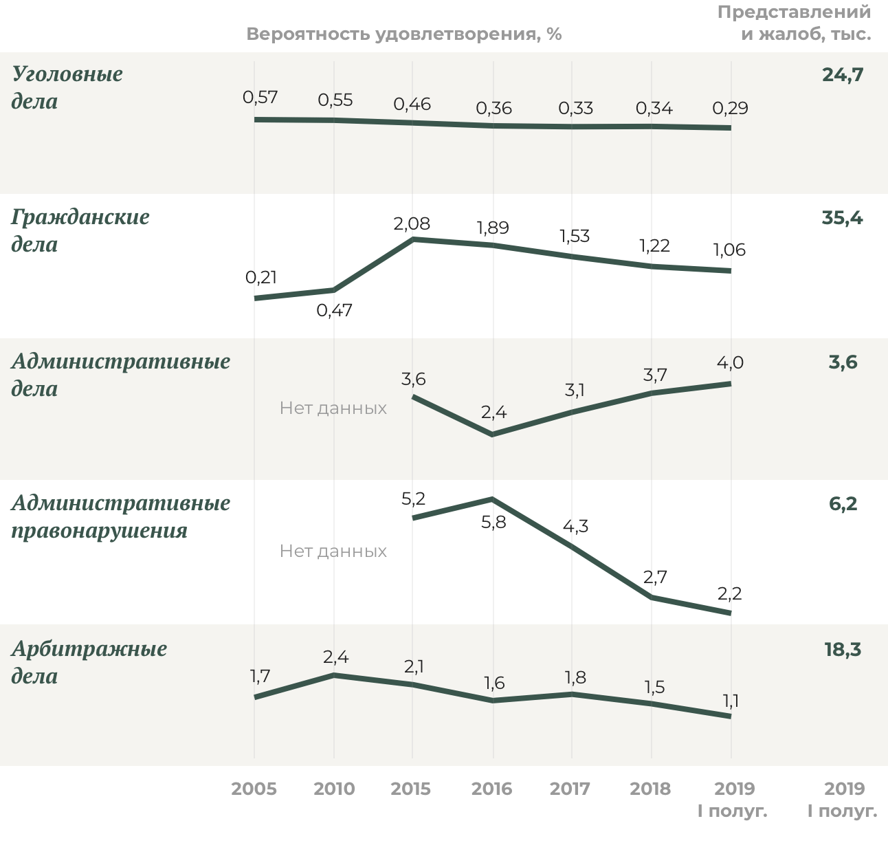 Меняется и сам Верховный суд. В последние пять лет более чем в два раза упали и без того невысокие шансы добиться пересмотра приговора в высшем судебном органе. Если в 2013 году Верховный суд принимал и удовлетворял 1 из 130 жалоб по уголовному делу, то сейчас — 1 из 340.