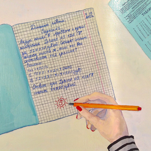 — У меня купили рисунок на Думской в кафе — это был первый раз, когда у меня что-то купили. Это было лет в 18. Мужик подкатывал к моей подруге, я его рисовала, а он мне дал потом сто рублей. Я помню, как он мне бумажку в руку положил, типа здороваясь, как в кино показывают — когда чувак приносит чемоданы и ему дают на чай. Это мое первое воспоминание о деньгах, связанных с творчеством. А так — помню, как ко мне приезжал паренек из Питера в 2015 году: увидел где-то во «ВКонтакте» мои работы. Он — 18-летний коллекционер. Приехал и говорит: «Я хочу у тебя что-нибудь купить». И купил у меня небольшую работку из серии «Гаджетизация».