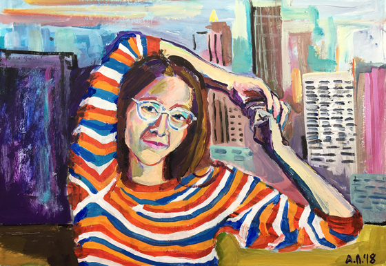 © Алена Лёвина Автопортрет. Бумага, акрил. 2016 — А как бы ты описала свой мир? У тебя есть любимые образы, темы?